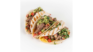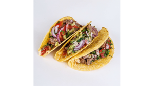 Kukurydziane tacos, szarpana wołowina, sos serowy, guacamole, limonka, cebula czerwona, śmietana i świeża kolendra