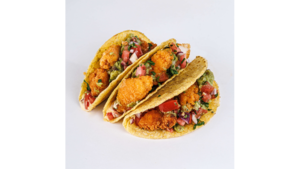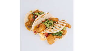 Pszenne tacos, krewetki w tempurze, sos serowy, guacamole, limonka, cebula czerwona, śmietana i świeża kolendra