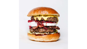 360 g świeżo mielonej wołowiny, podwójny bekon, bułka brioche z sezamem, sos mango mayo, sos BBQ, kozi ser, konfitura porzeczkowa, cebula czerwona, sałata
