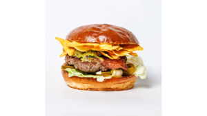 180 g świeżo mielonej wołowiny, bekon, bułka brioche z sezamem, sos serowy, guacamole, nachos, jalapeño, cebula czerwona, ogórek kiszony, sałata