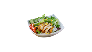Mix sałat, pomidor, cebula czerwona, chrupiący kurczak, bekon, tarty ser gouda, grzanki, pestki dyni
