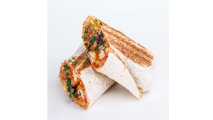 Zawijana tortilla z chrupiącym kurczakiem, ryżem meksykańskim, pastą z czarnej fasoli, mixem serów, mango mayo, salsą i świeżą kolendrą