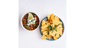 2 kukurydziane tacos, chilli con carne, sos serowy, guacamole, limonka, cebula czerwona, śmietana i świeża kolendra
