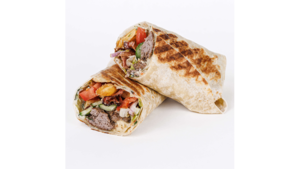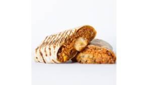 Zawijana tortilla z szarpaną wołowiną, ryżem meksykańskim, pastą z czarnej fasoli, mixem serów, mango mayo, salsą i świeżą kolendrą