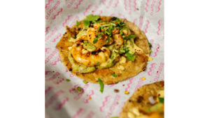 2 kukurydziane tacos, krewetki, sos serowy, guacamole, limonka, cebula czerwona, śmietana i świeża kolendra