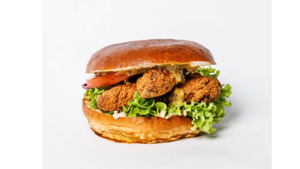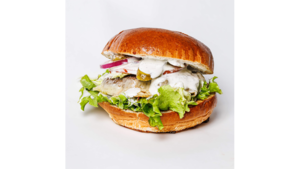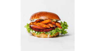 Chrupiący kurczak, bułka brioche z sezamem, sos classic, sos musztardowo-miodowy, pomidor, czerwona cebula, ogórek kiszony, sałata