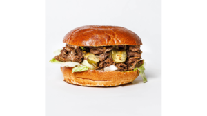 180 g szarpanej wołowiny, bułka brioche z sezamem, ser gouda, sos classic, sos czosnkowy, pomidor, cebula czerwona, ogórek kiszony, sałata