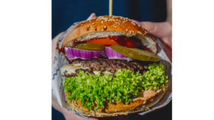 Kotlet z buraka, bułka brioche z sezamem, sos classic, sos czosnkowy, pomidor, cebula czerwona, sałata, frytki batat, ogórek kiszony