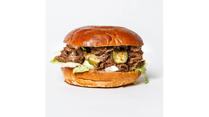 180 g szarpanej wołowiny, bułka brioche z sezamem, sos musztardowo-miodowy, sos classic, cebula czerwona, ogórek kiszony, sałata